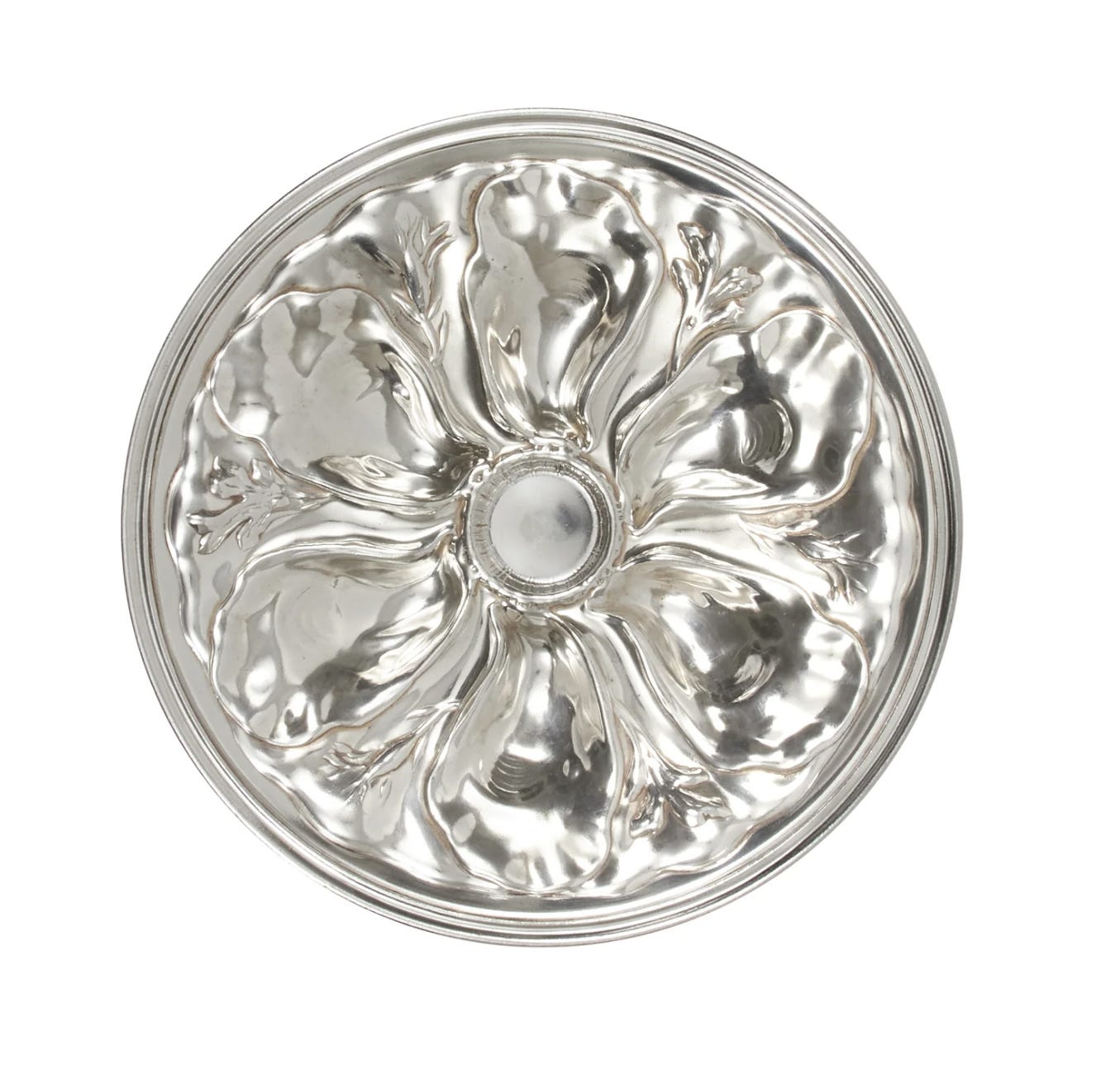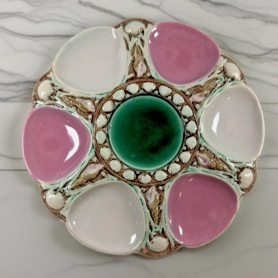 I get it if you’re not into the whole Majolica thing. So here is an alternative, and you can really never go wrong with silver. There are also many other silver oyster plates from defunct hotels you can purchase. The wells in this one have a particularly nice shape though.
