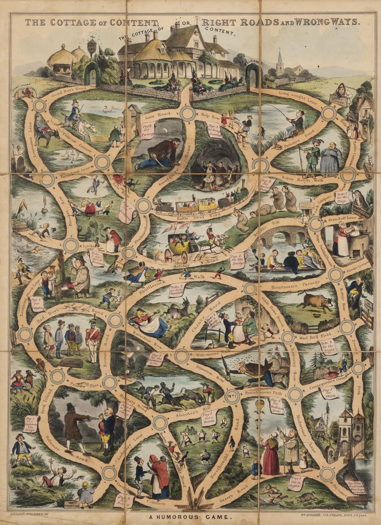 Voyage to the Cottage of Content was my personal favorite. I think we should bring this one back. Replete with alliterative gold, the game is exactly what it sounds like, with detours to patience pond, consequence corner, poverty path (for those less fortunate), and a journey through prudence passage to long-sought lane for those with a bit more luck. Another one I loved was Road to the Temple of Honour and Fame. The titles alone just reveal so much, and I find them very endearing. My last favorite was the simply titled Gothic Board Game.